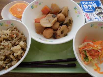 鶏牛蒡ご飯・おでん・白菜のゆず風味・ミカン・牛乳