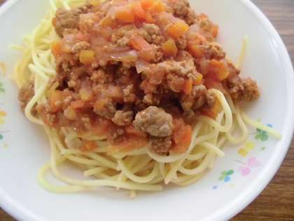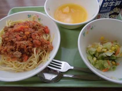 スパゲティミートソース・コールスロー・オレンジポンチ・牛乳