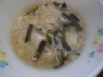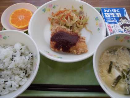 わかめご飯・イカのチリソース・春雨サラダ・にらたまスープ・ミカン
