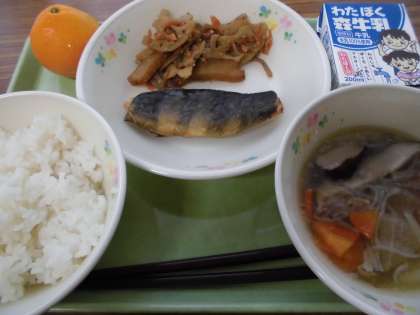 ご飯・ホッケの塩焼き・レンコンのきんぴら・沢煮椀・みかん・牛乳