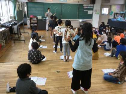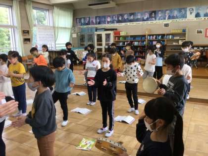 3校時、2拍子を感じながらリズムを打つ学習です。