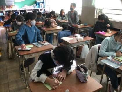 5校時、医療従事者の方々へのメッセージカードを作成しています。