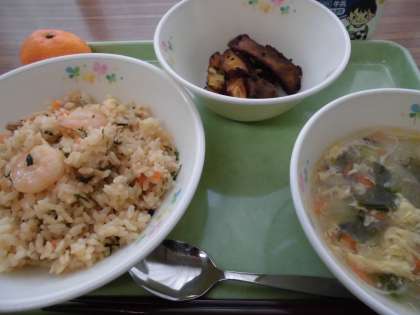 中華風混ぜご飯・ビーフン玉子スープ・スティック大学芋