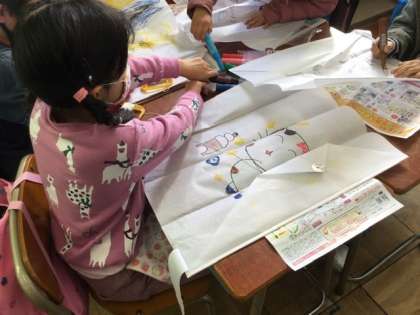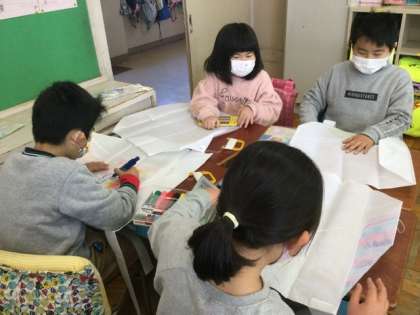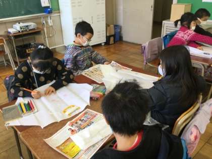 3校時、凧に絵を描いています。