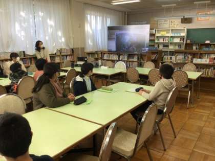 鹿島小の学校紹介を聞いています。