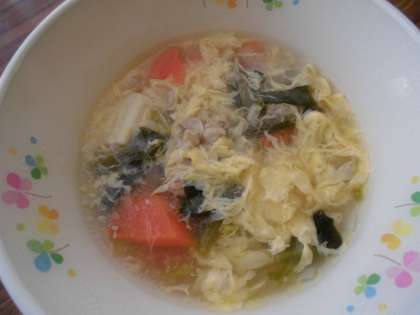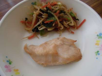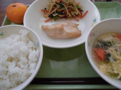 ご飯・鶏肉の味噌焼き・野菜のおかか和え・かき玉汁・ミカン・牛乳