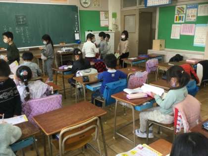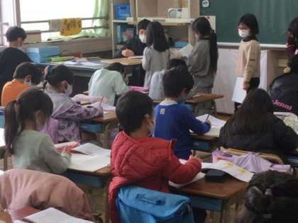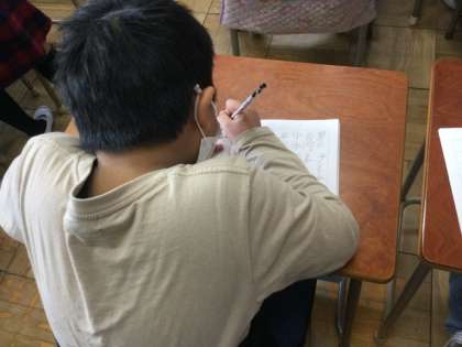 先生が点検中も無駄にせず、漢字の練習をしています。