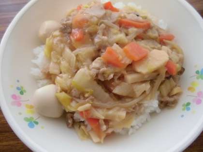 五目うまに丼・ビーフンサラダ・玉子スープ・はるみ(1/4)