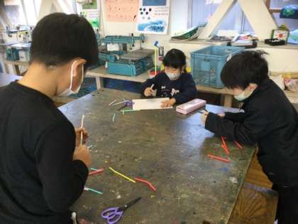 1校時、ストローで動く仕組みを使う作品を作っています。