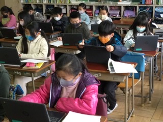 1校時、昔の道具の新聞づくりをしています。