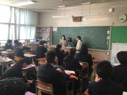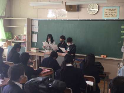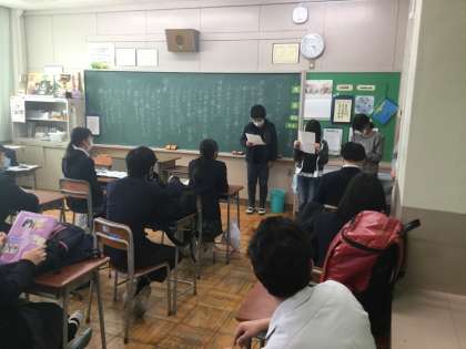 この写真は、児童会・代表委員会が中学部に協力のお願いをしている様子です。