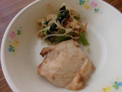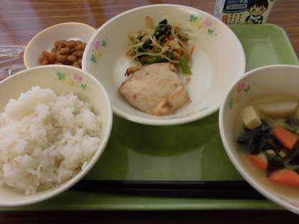 麦ご飯・照り焼きチキン・ウドのごま和え・ブドウ豆・味噌汁