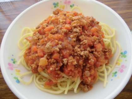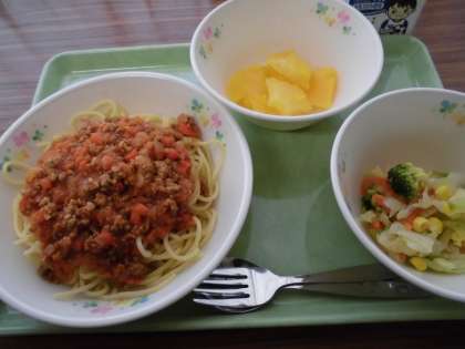 スパゲティミートソース・フレンチサラダ・パインゼリー・牛乳