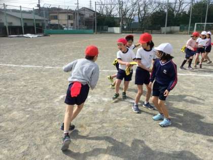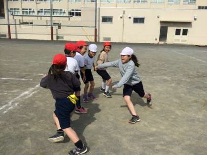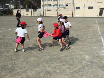 5人がつながり、鬼?が最後尾の子どもにタッチできたら鬼の勝ちになるゲーム?をしています。