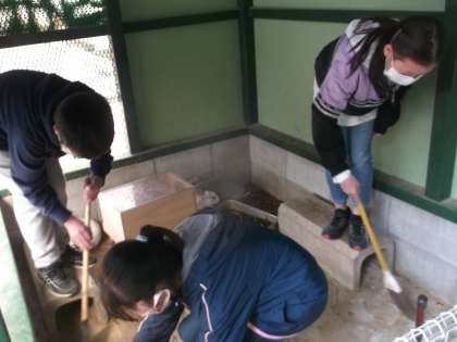 飼育委員会では、毎日、中休みにうさぎ小屋の掃除・えさやりをしています。