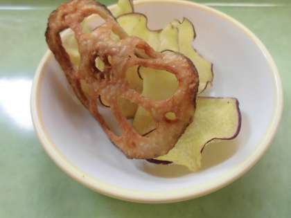 根菜チップスは、サツマイモとレンコンです。きれいな黄色に揚がっています。