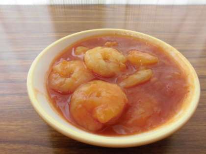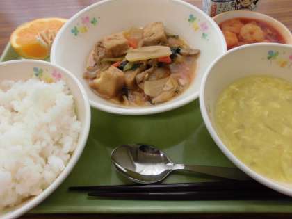 ご飯・家常豆腐・エビチリ・コーンと卵のスープ・いよかん