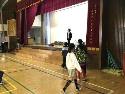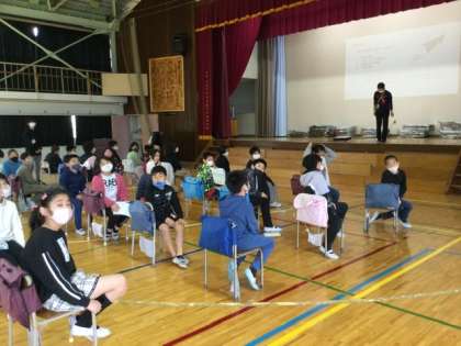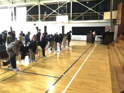 1校時、体育館で1/2成人式のリハーサルをしています。