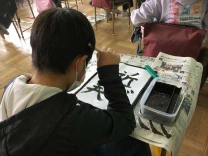 2校時、「近づく春」を毛筆で練習しています。