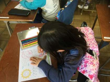 先生に花マルをもらって、嬉しそうです。