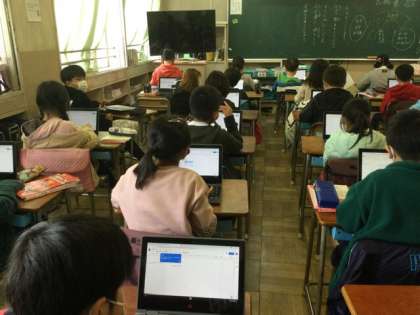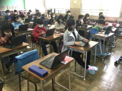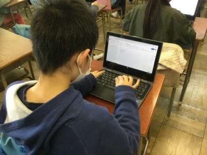 1校時、タブレットで文章を入力しています。