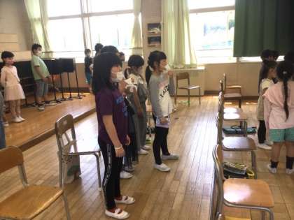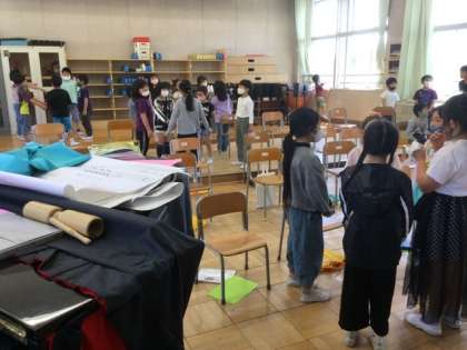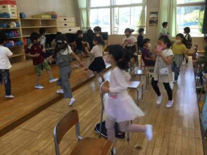 リズムに合わせて移動し、ペアを作って練習しているようです。