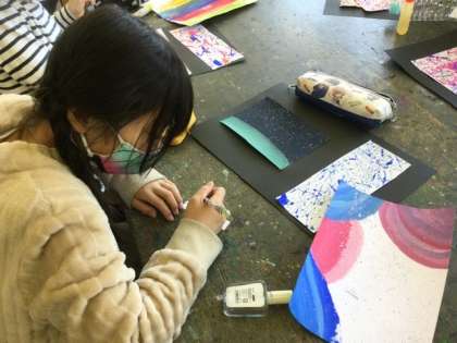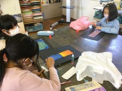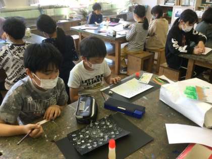 3校時、前回の授業の作品を掲示用の台紙に貼っています。