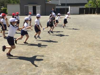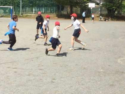 体育では、元気いっぱい走っています。