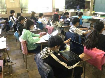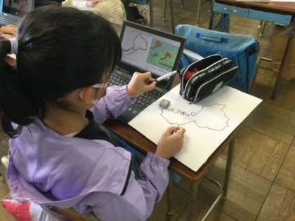 タブレットや地図帳で調べ、問題を作るようです。