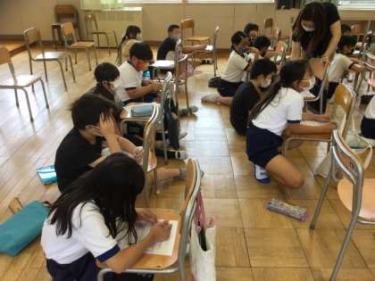 3校時、「歌のにじ」と言う曲の音名を楽譜に書いています。