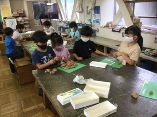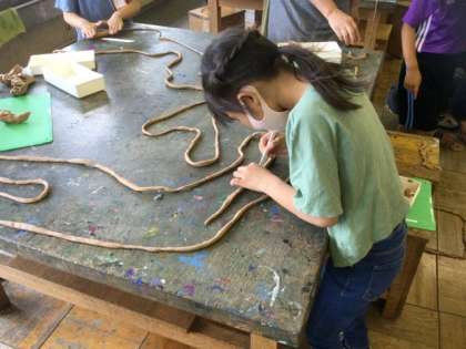3校時、粘土で長〜い蛇を作っています。