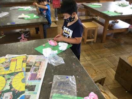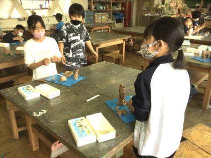 図工では、粘土や箱などを使って、様々な制作活動をしています。