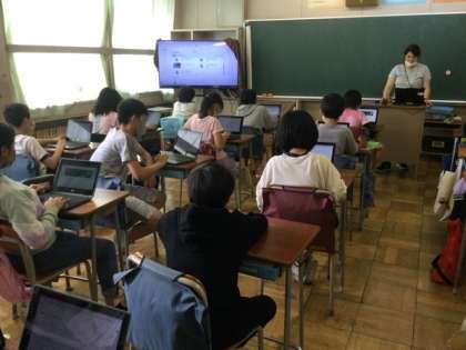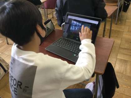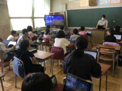 6校時、ソーラン節の練習を撮影した動画を見て振り返っています。
