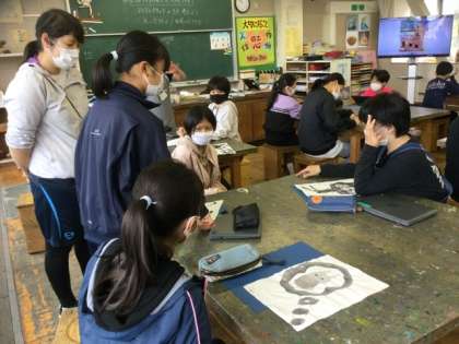 6年生の墨、1年生の紙粘土、5年生の針金での作品づくりです。