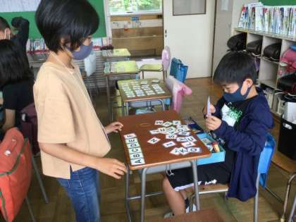 大文字のカードを順番に並べていました。