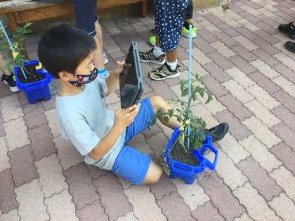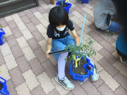 1校時、トマトの成長具合をタブレットで撮影しています。