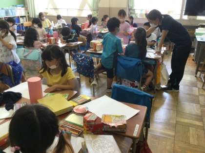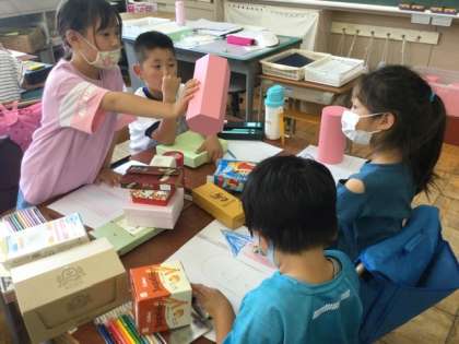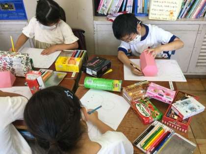 様々な形の箱を画用紙に写しとっています。