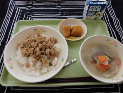 とん汁、牛乳となっていますが、鰆ではなく、鶏そぼろ丼に