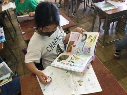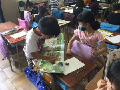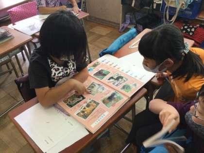図書の時間に借りた動物の本を使って、問題を考えています。