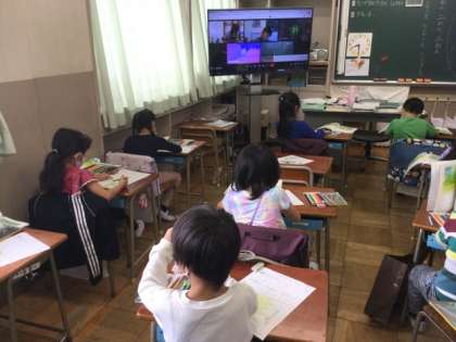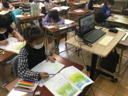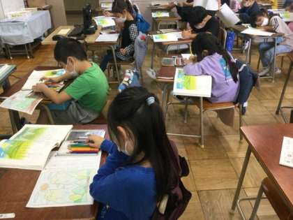 けんかしていた二つの山が仲直りした後の絵に色をにっています。