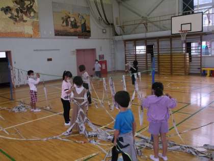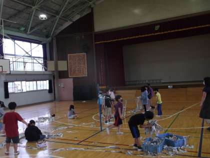 体育館に移動し、長くつなげた新聞紙を日もにひもにかけて作品を作っていきます。