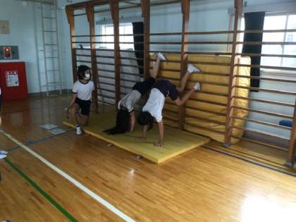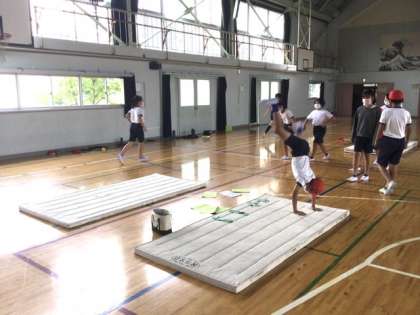 前転、後転、開脚前転、側転、倒立の練習です。