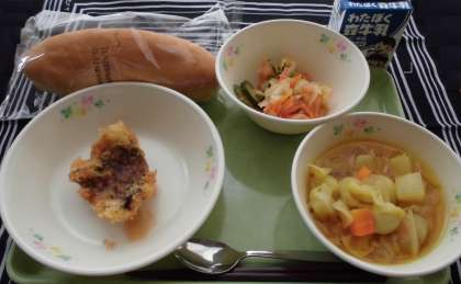 今日の給食では、カレースープ煮、トマトドレッシングサラダに、