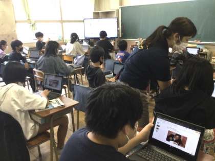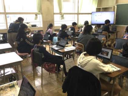 3校時、タブレットでスライドを作っています。