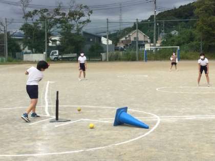 4校時、ティーベースボールをやっています。