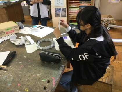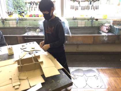 3校時、厚紙や段ボールを組んで作品を作っています。