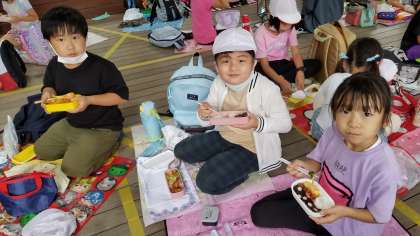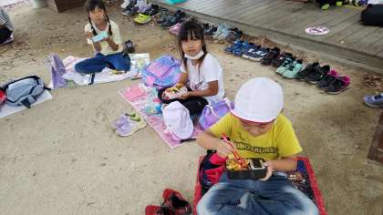 雨もやんできたので食べ終わった後、遊びの時間があるようです。