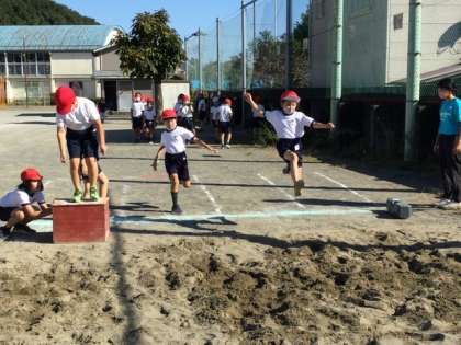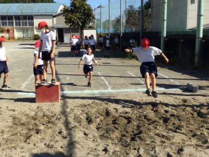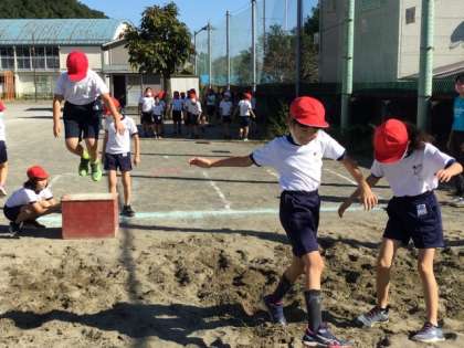 5校時、校庭で走り幅跳びの練習中です。