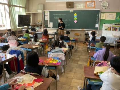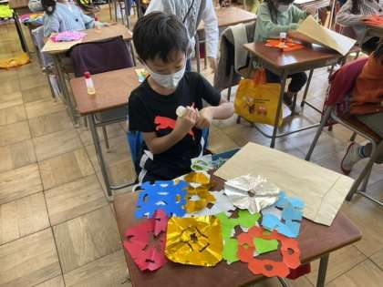 2校時、チョキチョキ飾りを完成させます。