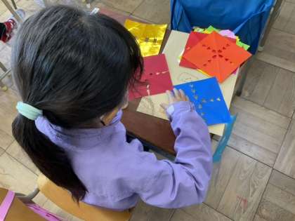 模様を切り抜いた折り紙をつなげます。